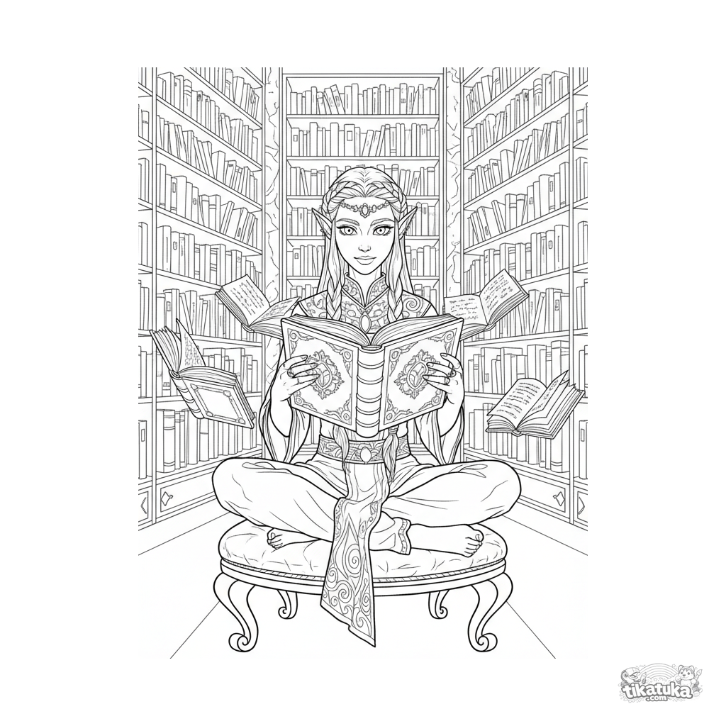 Детальная раскраска для детей 10-12 лет: эльф-архивариус читает древний парящий том в огромной библиотеке с кристаллическими полками.