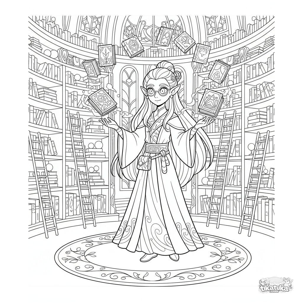 Раскраска для детей 10-12 лет: эльф-архивариус в волшебной библиотеке с помощью магии сортирует парящие древние книги. Сложная детализированная сцена.