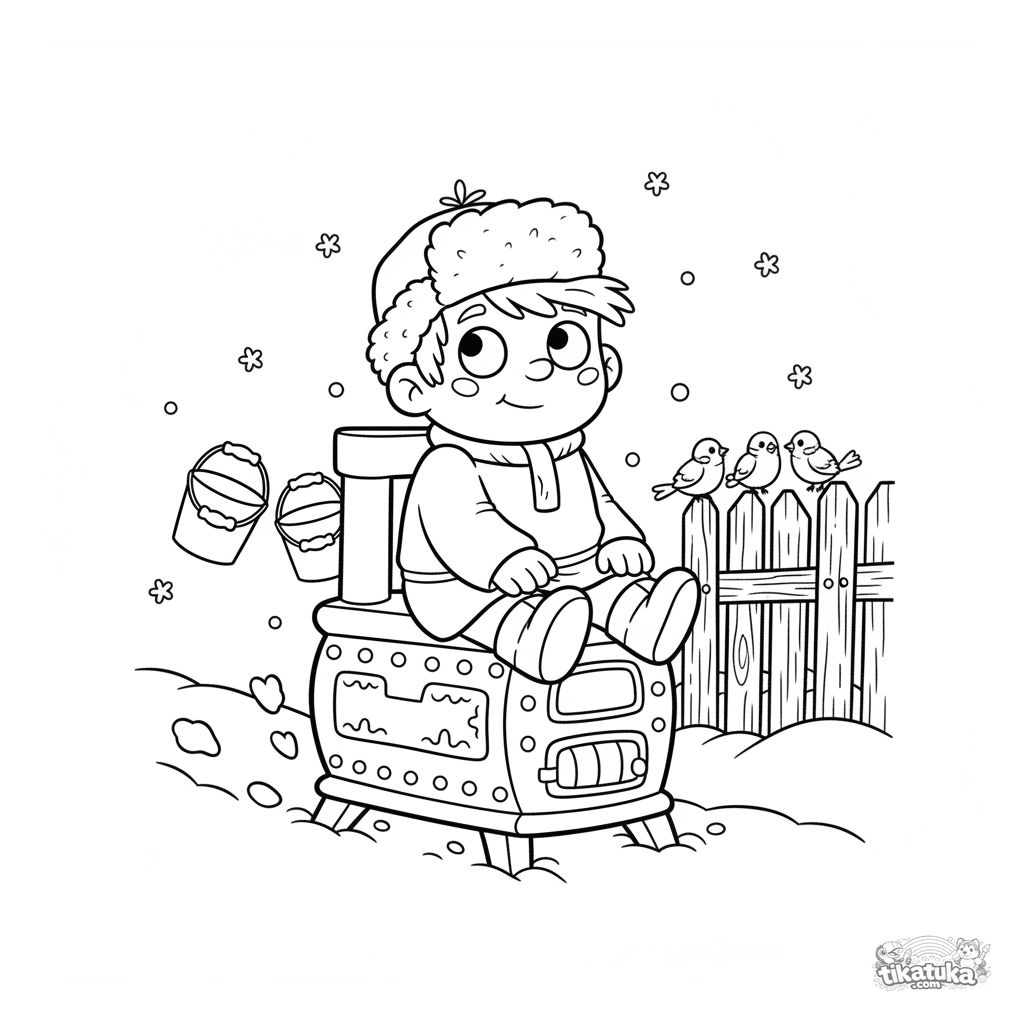 Весёлая раскраска по сказке про Емелю. Ленивый, но удачливый Емеля едет на волшебной печи по снежной деревенской улице. Для детей 4-6 лет.