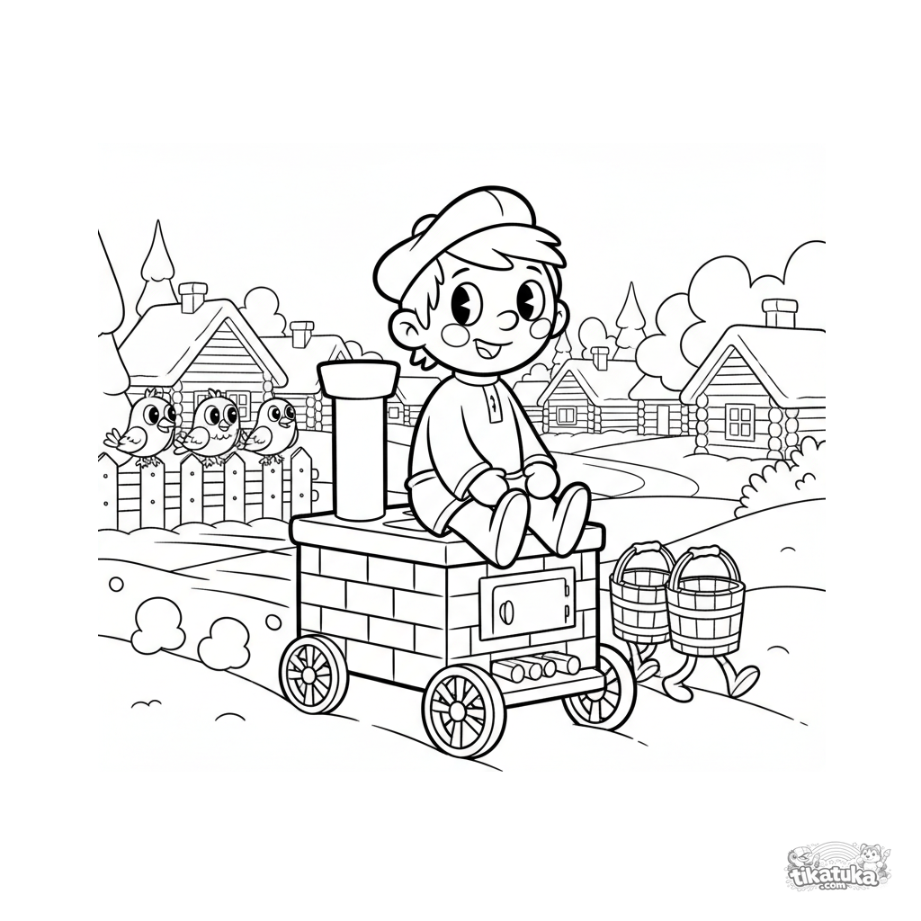 Веселая раскраска по сказке 'По щучьему веленью'. Емеля едет на волшебной печи по заснеженной деревне. Для детей 4-6 лет.