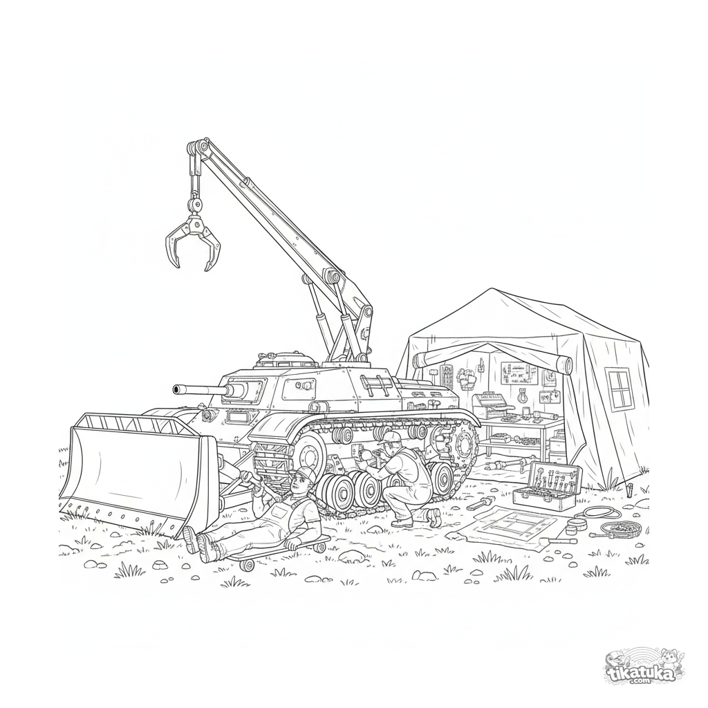 Сложная раскраска для детей 10-12 лет: инженерный танк с краном и отвалом находится на ремонте возле мастерской в полевом штабе. Механики работают с инструментами.