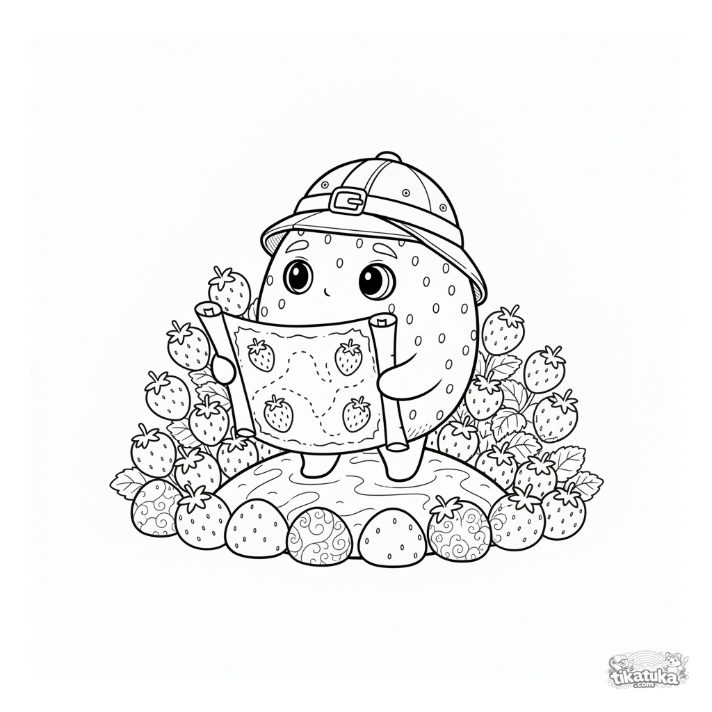 Реалистичная раскраска для детей 10-12 лет: моти-исследователь с картой в поле клубничных моти. Детальные контуры, атмосфера приключений.