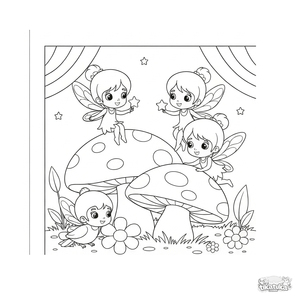 Раскрась этих милых феечек, летающих среди цветов и грибов. Прекрасное занятие для развития воображения и мелкой моторики.