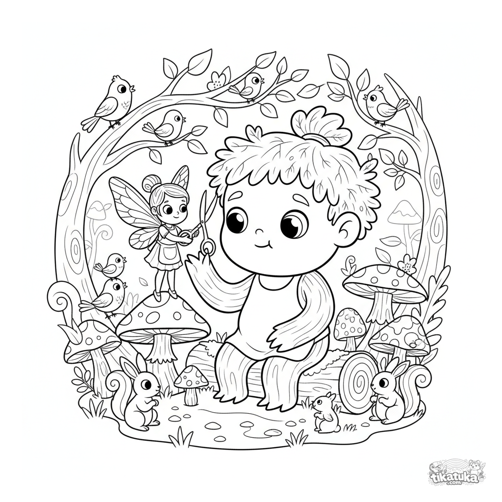 Раскраска для детей 4-6 лет: милая фея-парикмахер стрижет листву у большого доброго древня в волшебном лесу. Сцена о дружбе и заботе в классическом мультяшном стиле.