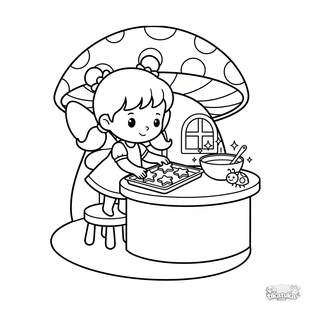 Простая раскраска для малышей 2-3 лет: крошечная принцесса-фея печет волшебное печенье на кухне в домике-грибе. Очень крупные, простые формы.