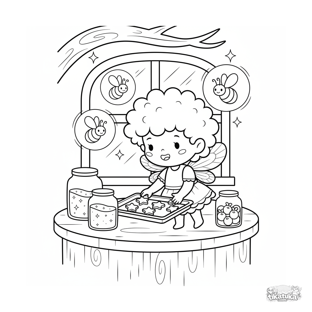 Раскраска для малышей 2-3 года: крошечная фея-принцесса печёт печенье на кухне в домике на дереве. Очень крупные, простые и милые формы.