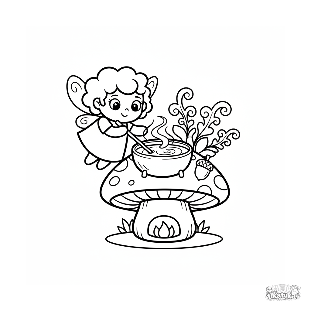 Простая раскраска для малышей 2-3 лет: крошечная фея-принцесса готовит волшебный суп на грибе. Крупные, дружелюбные формы.