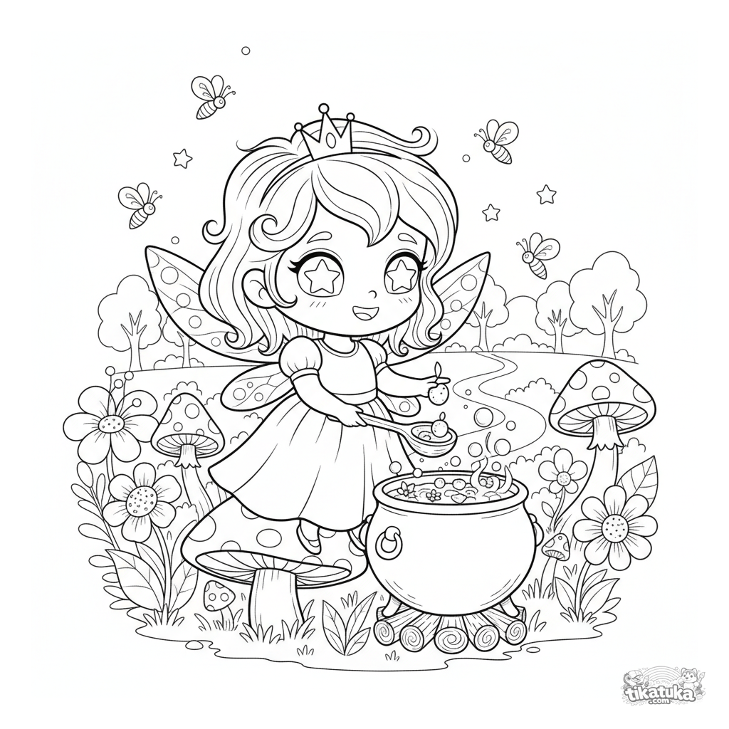 Раскраска для детей 4-6 лет: крошечная фея-принцесса с крылышками варит волшебное зелье из лепестков в котле среди волшебного сада с светящимися грибами.