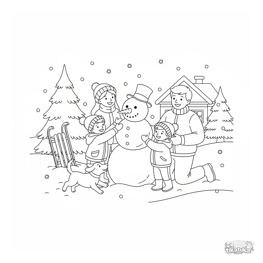 Раскраска для детей 4-6 лет на зимнюю тему: счастливая семья лепит снеговика в солнечный день. Реалистичный стиль, много деталей для раскрашивания.