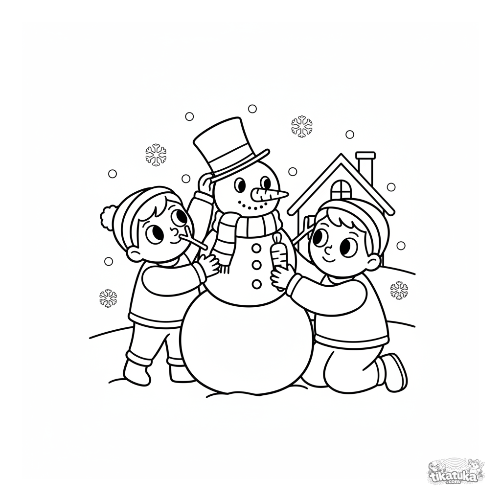 Раскраска для детей 4-6 лет на зимнюю тему: счастливая семья лепит снеговика с морковкой и шарфом во дворе. Тёплая сцена с падающим снегом.