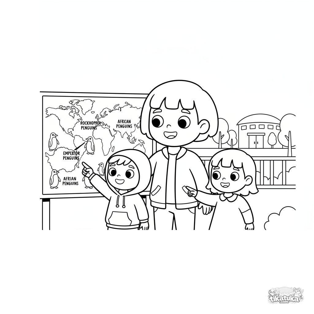 Раскраска для детей 7-9 лет: семья изучает большую карту с разными видами пингвинов и их ареалами обитания в зоопарке. Образовательная сцена про географию животных.