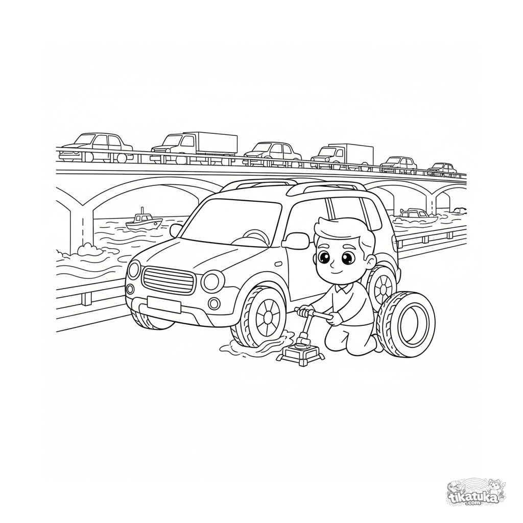 Раскраска для детей 4-6 лет: семейный внедорожник остановился на мосту из-за прокола колеса. Папа меняет колесо, на заднем плане река.