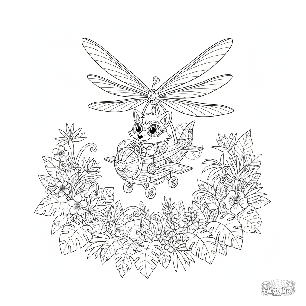Сложная раскраска для детей 10-12 лет: фантастический механический орнитоптер с лисой-изобретателем пролетает над джунглями. Богатая детализация, интересные механизмы, фон с растительностью.