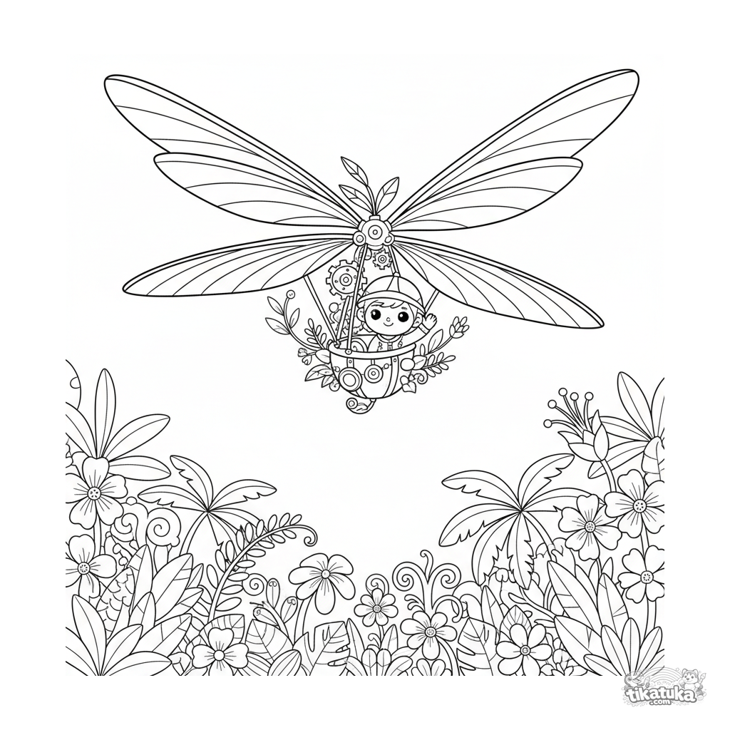 Раскраска фантастического орнитоптера с машущими крыльями, летящего над джунглями. Иллюстрация в стиле фэнтези для детей 7-9 лет, развивающая творческое мышление.