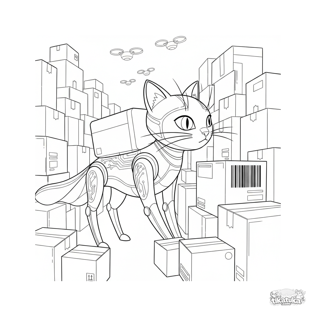 Сложная раскраска для детей 10-12 лет: реалистичный робот в форме кота с антенками-усиками пробирается по лабиринту из коробок на огромном складе, сканируя штрих-код.