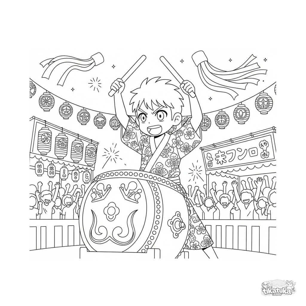 Яркая раскраска в стиле аниме: барабанщик играет на тайко на шумном летнем мацури. Фон с фонариками, стримерами и толпой. Для детей 10-12 лет.
