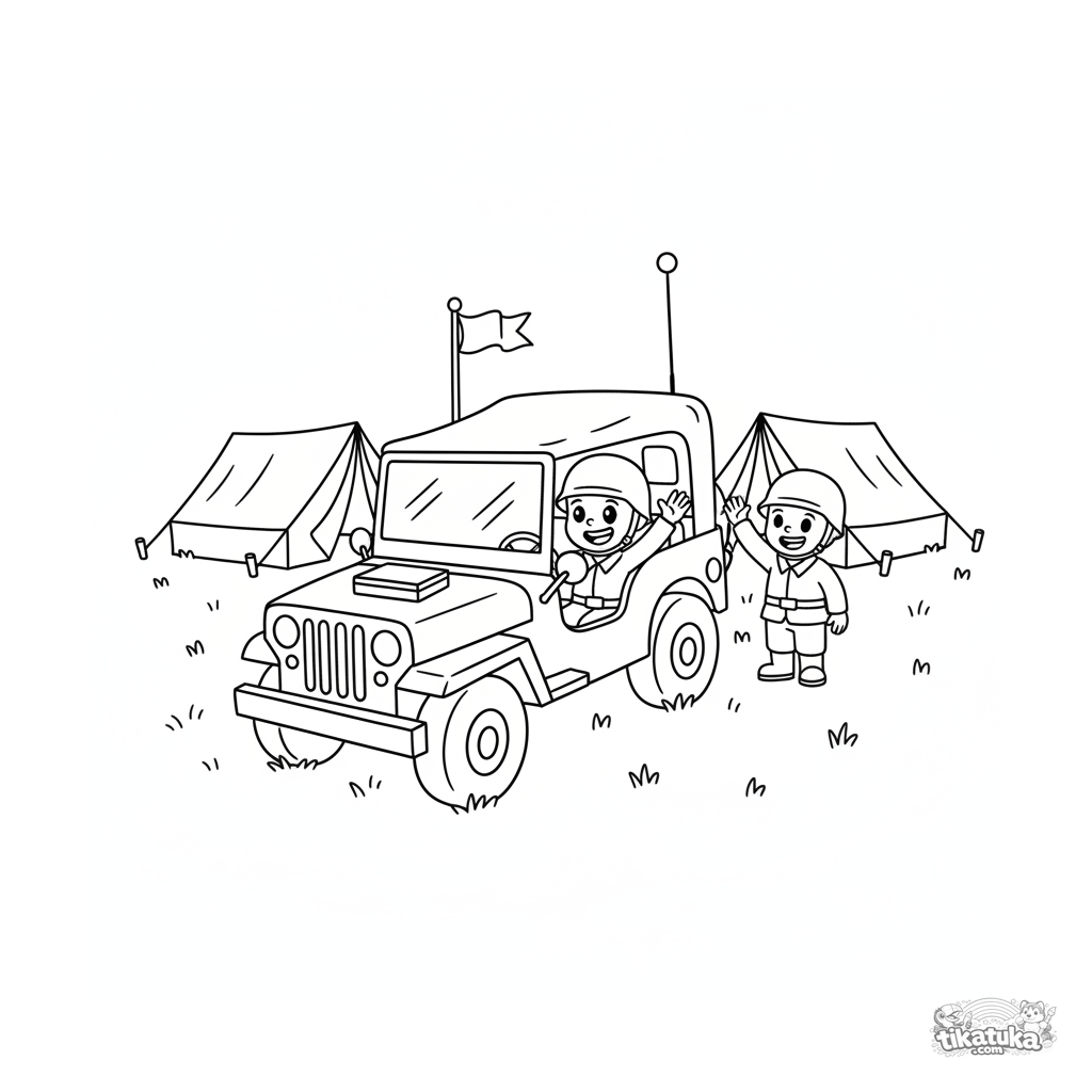 Раскраска для детей 4-6 лет: командирский джип с радиостанцией, припаркованный возле полевого штаба с палатками. Весёлый водитель машет рукой.