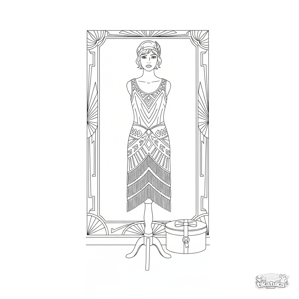 Детализированная раскраска в стиле научного определителя для девочек 10-12 лет: платье флэппер 1920-х годов на манекене в витрине бутика в стиле ар-деко.
