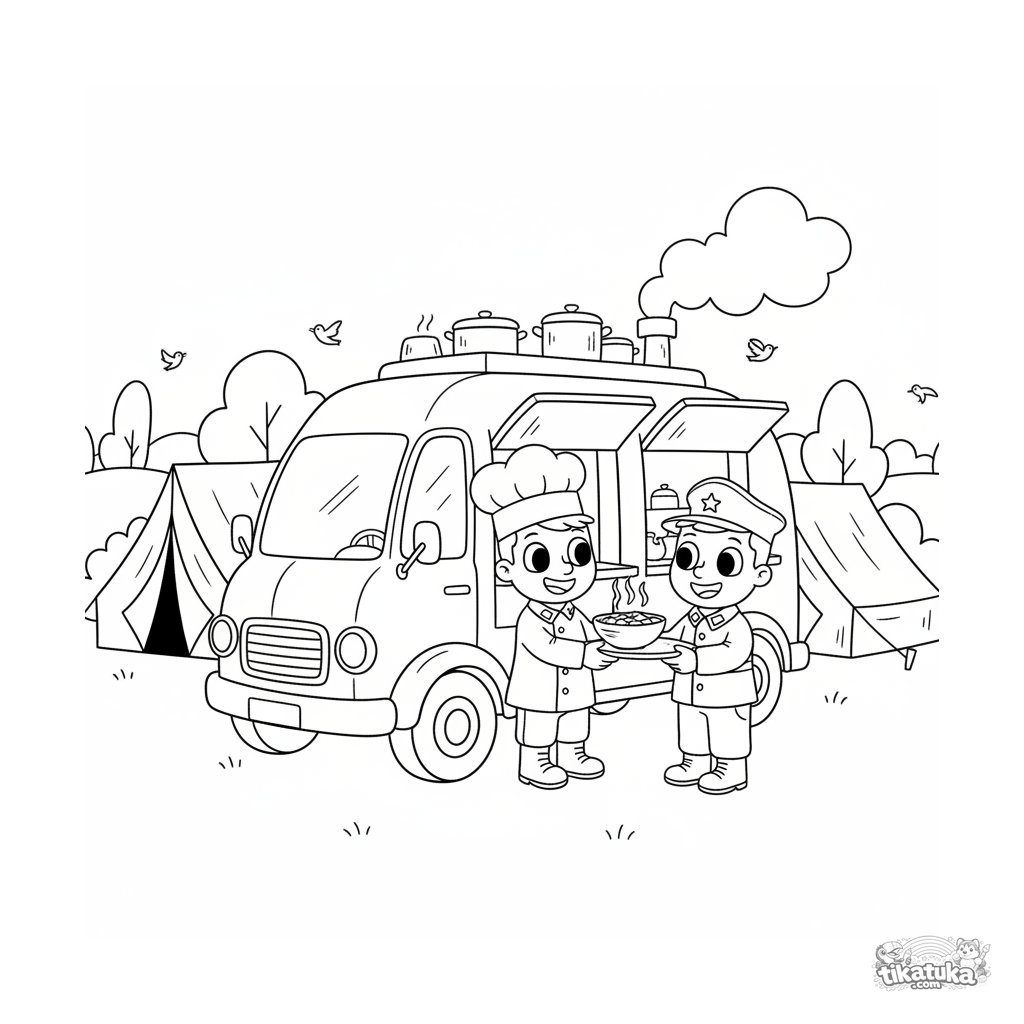 Раскраска для детей 4-6 лет: весёлая полевая кухня на колёсах раздаёт обед солдатам у палаток штаба. Повар и солдат улыбаются. Яркая, добрая сцена.