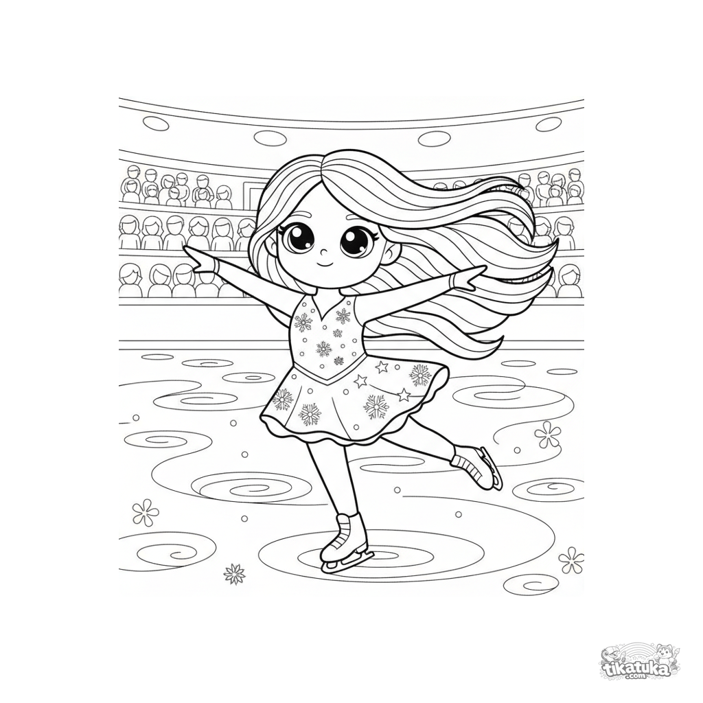 Детальная раскраска для детей 7-12 лет: фигуристка исполняет пируэт на льду. Элегантная сцена с элементами костюма и декорациями арены.