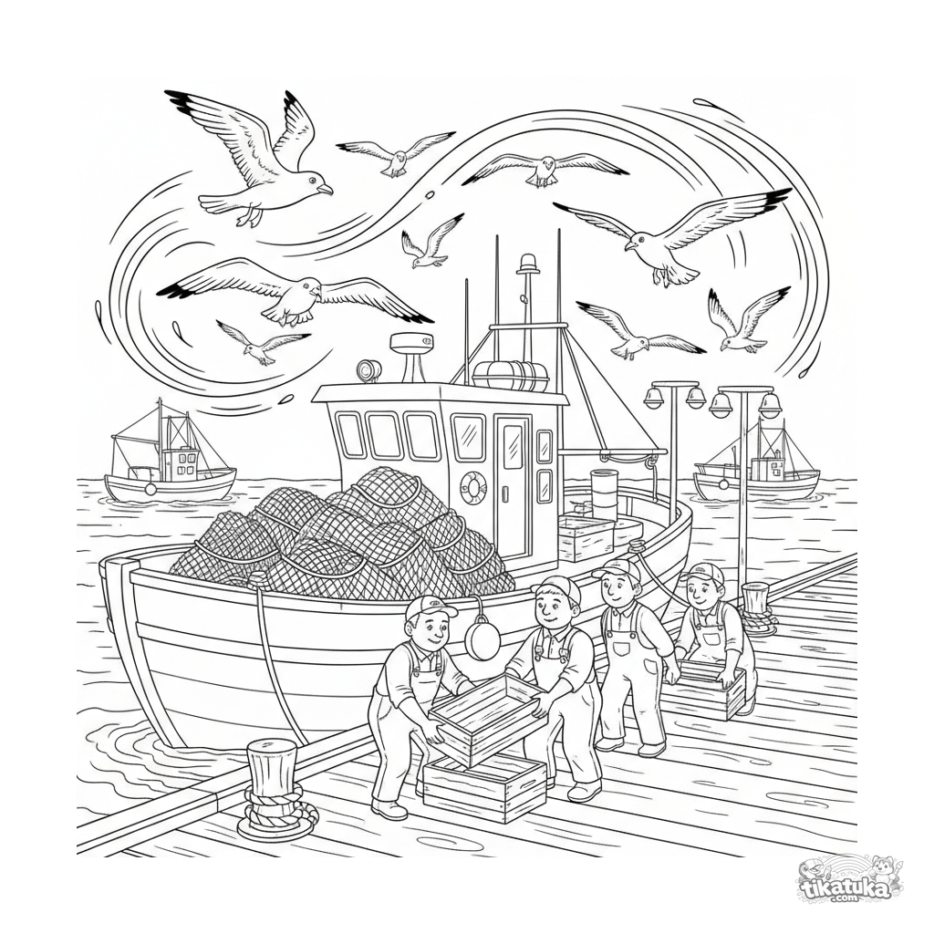 Детализированная раскраска для детей 10-12 лет: рыболовный траулер разгружает улов в сумерках в оживлённом порту. Реалистичная сцена с моряками и чайками.