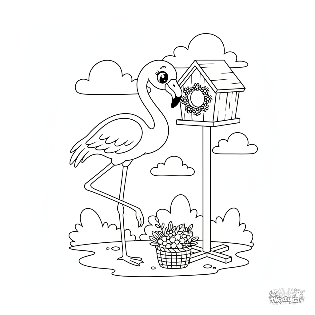 Раскраска для детей 7-9 лет: изящный фламинго на одной ножке украшает вход в деревянный скворечник гирляндой из маргариток. Стиль аниме-сёдзё, элегантные линии.