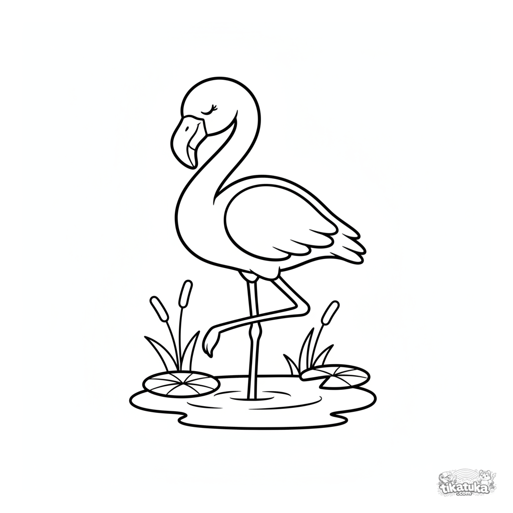 Простая раскраска для малышей 2-3 лет: фламинго стоит на одной ноге у пруда и спит. Крупные простые формы, широкие поля для раскрашивания.