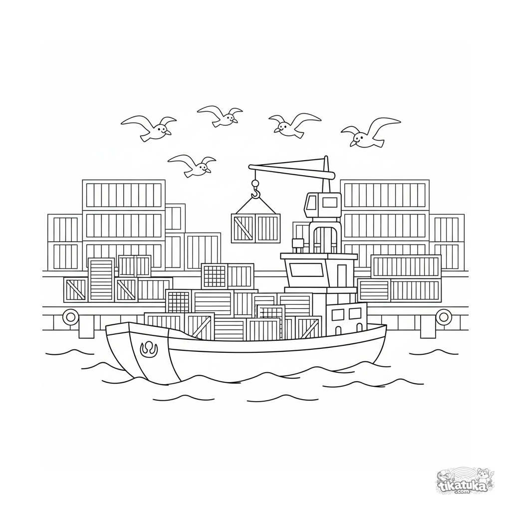 Раскраска для детей 7-9 лет: грузовая баржа в современном плоском векторном стиле загружается в промышленном порту. Геометрические формы, контейнеры, кран.