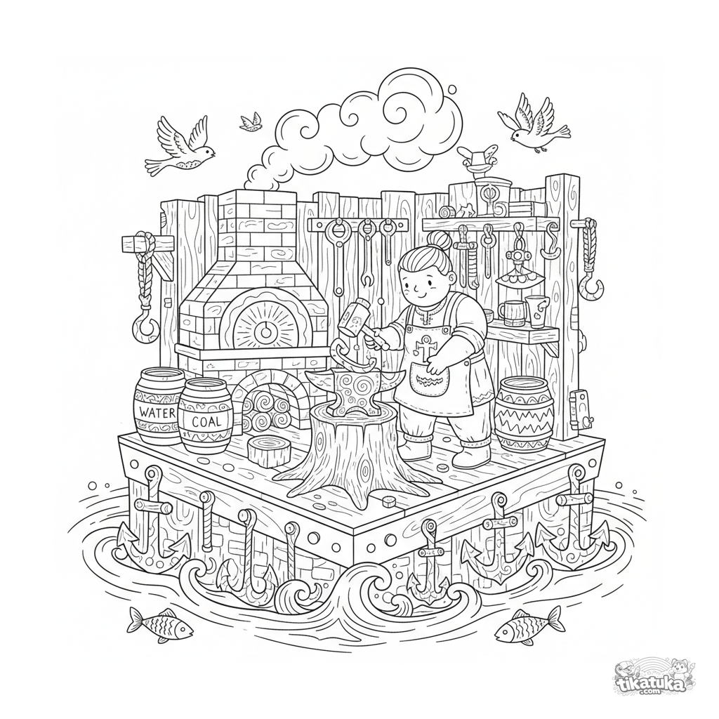 Раскраска плавучей кузницы в народном лубковом стиле для детей 10-12 лет. Детали: горн, наковальня, кузнец с молотом, инструменты, бочки.