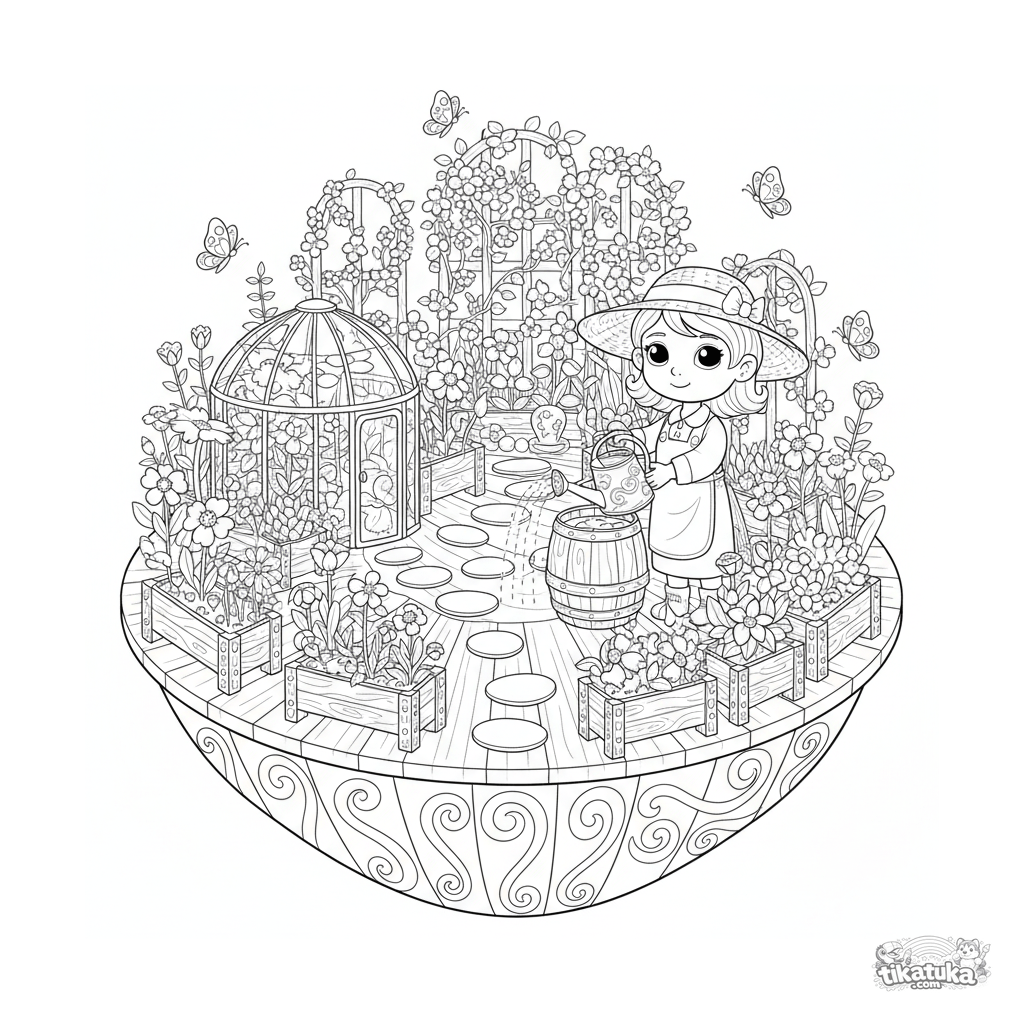Детализированная раскраска для детей 10-12 лет: архитектура плавучего сада на морской платформе с оранжереей, цветами и садовником.