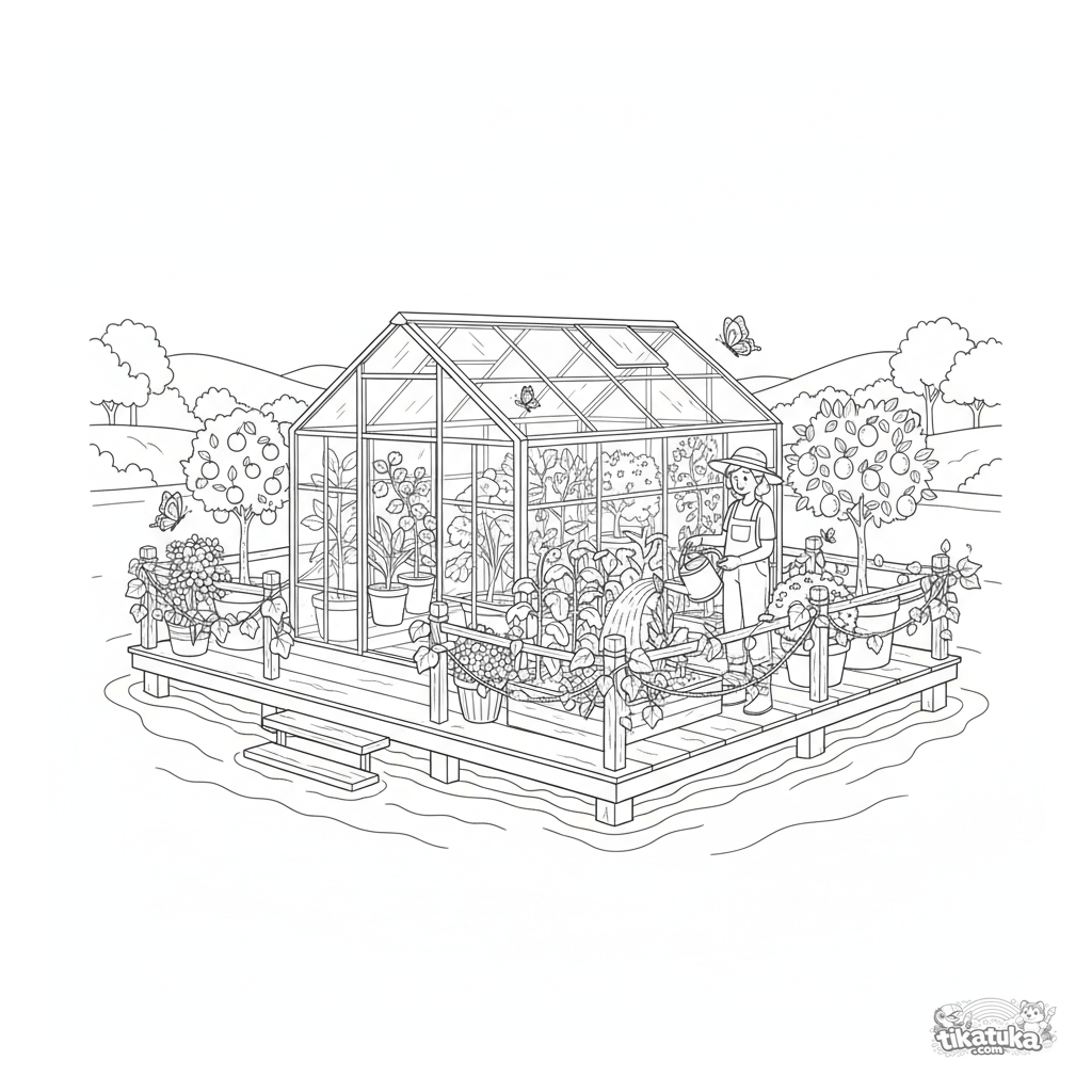 Раскраска для детей 10-12 лет: детализированный плавучий сад с теплицей, грядками и деревьями в горшках на морской платформе. Садовник поливает растения, вокруг летают бабочки.