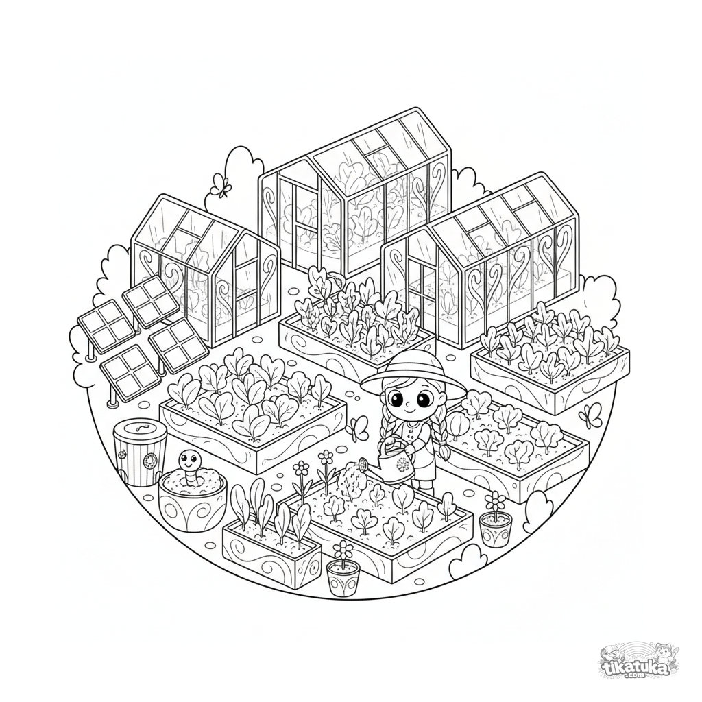Раскраска для детей 10-12 лет: экологичная плавучая платформа-сад с теплицами, грядками и солнечными панелями. Садовник поливает растения, вокруг летают бабочки.