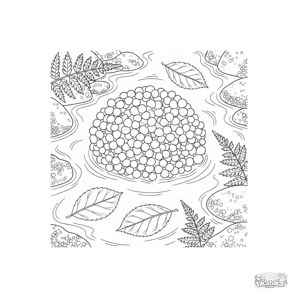 Раскраска для детей 10-12 лет: детализированное соцветие гортензии, состоящее из множества мелких цветков, плавает по поверхности лесного ручья.