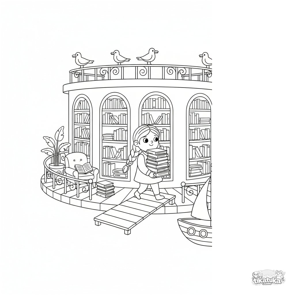 Раскраска для детей 10-12 лет: уютная плавучая библиотека на морской платформе. Детальная сцена с библиотекарем, парусником, чайками и книгами для раскрашивания.