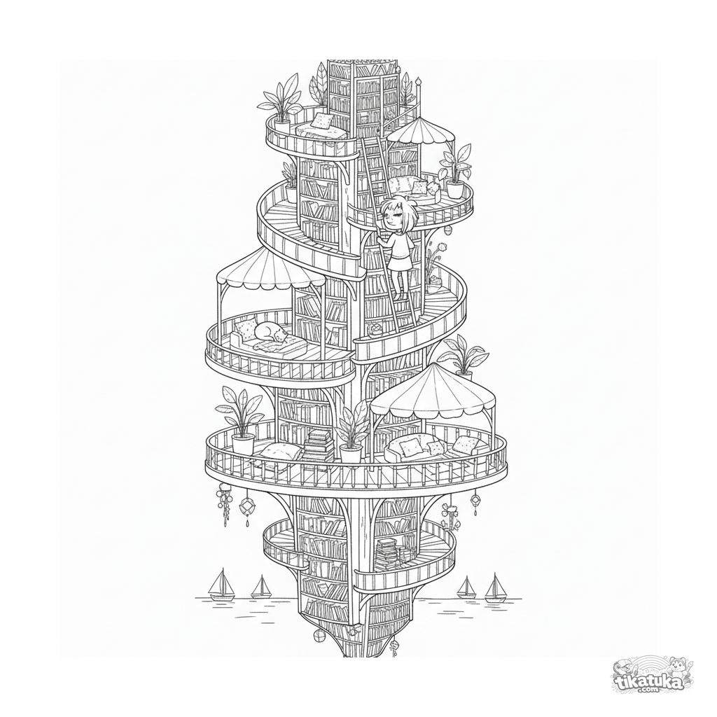 Раскраска для детей 10-12 лет: многоуровневая плавучая библиотека со спиральным пандусом, книжными полками и уютными уголками для чтения. Библиотекарь на лестнице, кот спит.