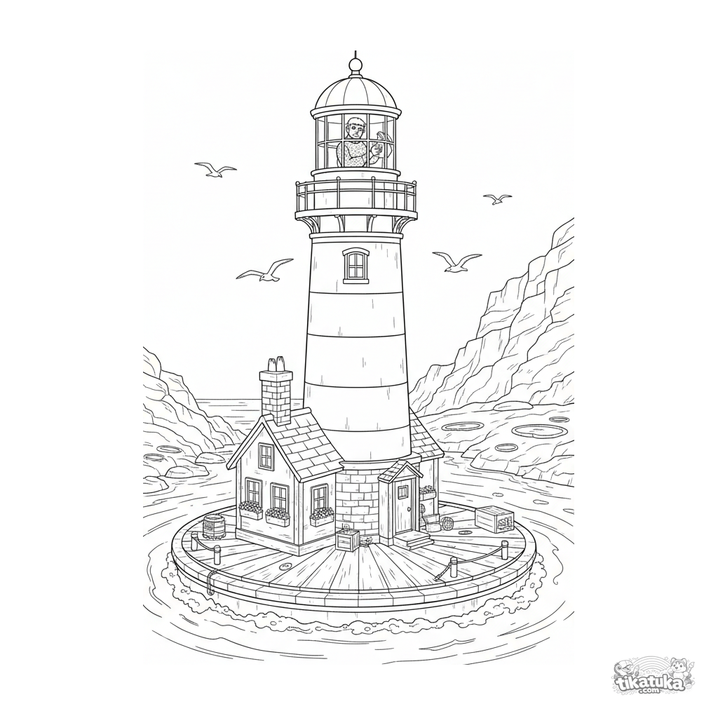Раскраска для детей 10-12 лет: детализированный плавучий маяк с домом смотрителя на круглой платформе в скалистой бухте. Смотритель, чайки, волны и архитектурные детали.