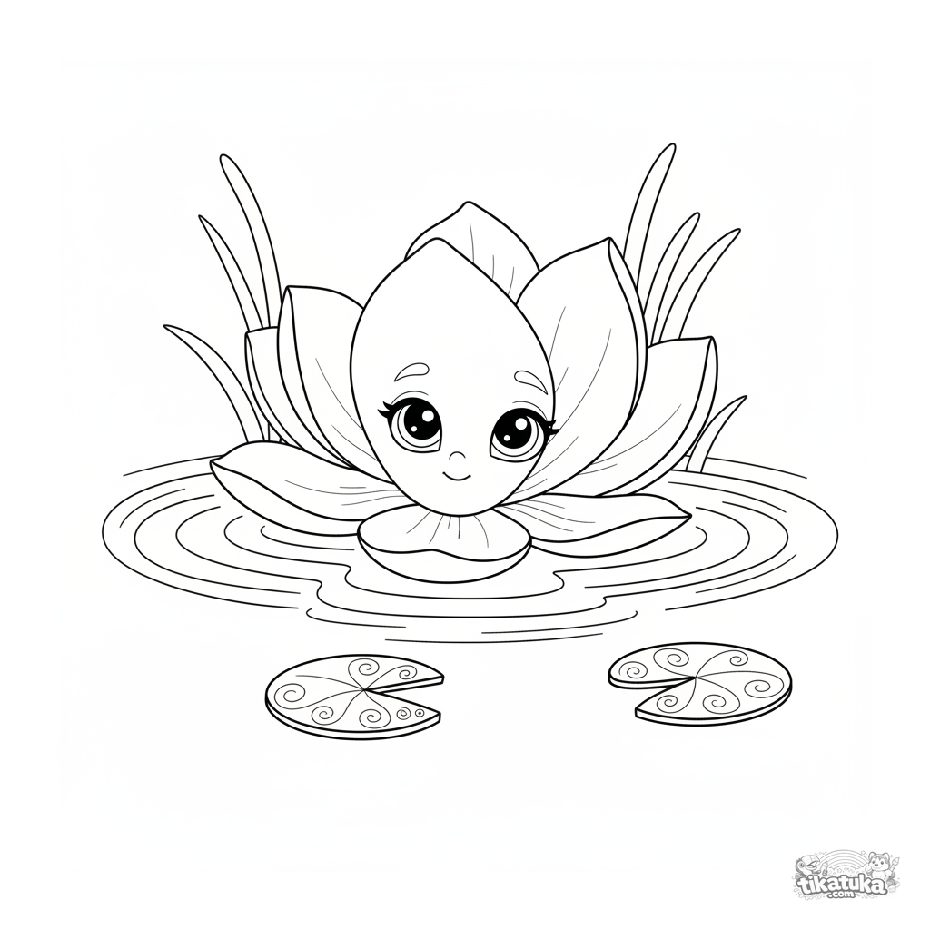 Раскраска для детей 4-6 лет: большой цветок магнолии плывет по спокойному пруду с рябью. Плавные линии, умиротворяющая сцена, понятные формы.