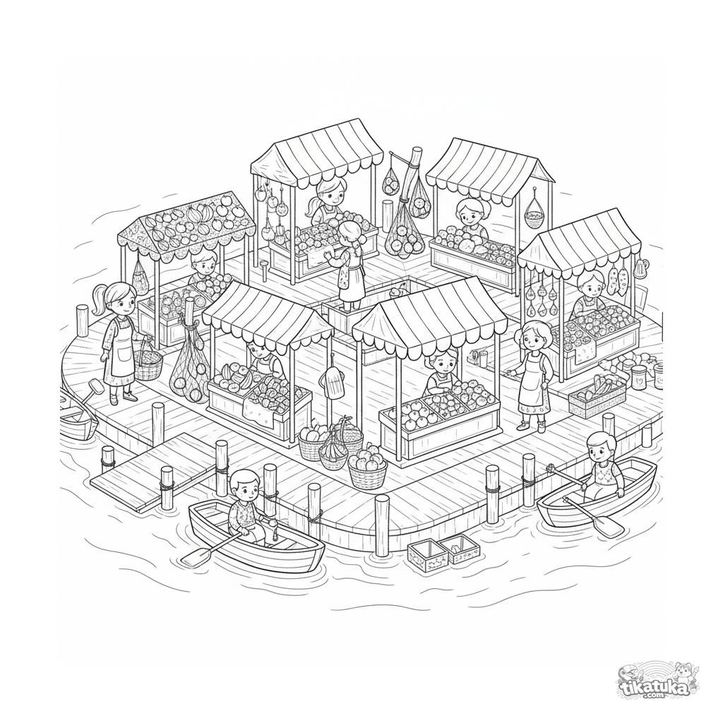 Раскраска для детей 10-12 лет: оживленный плавучий рынок на большой платформе в морской бухте. Лотки с тентами, продавцы, покупатели в лодках, деревянные мостки.