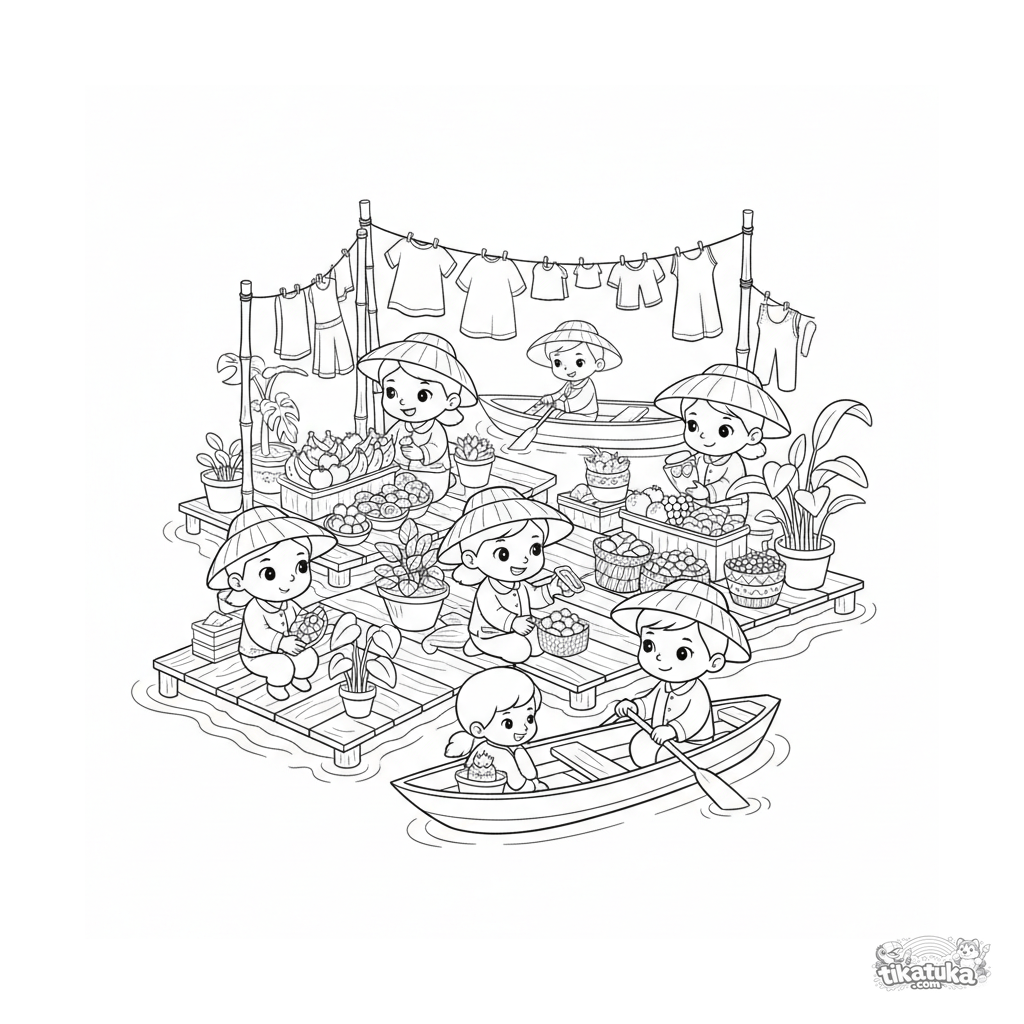 Раскраска для детей 10-12 лет: оживленный плавучий рынок на деревянных платформах в море. Продавцы, покупатели в лодках, товары и украшения. Сложная многослойная сцена с деталями.