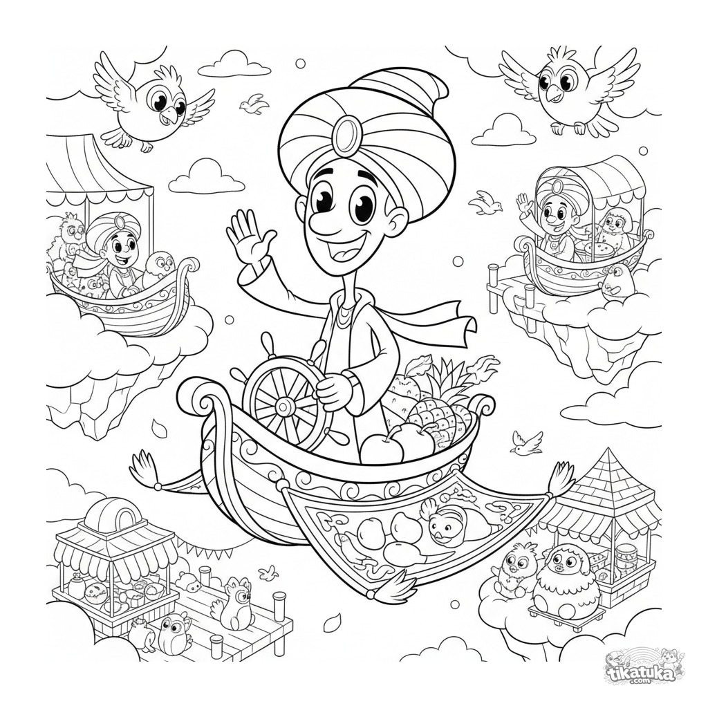 Веселая раскраска для детей 4-6 лет: торговец на летающем ковре-лодке продает товары на плавучем рынке в облаках. Яркий, динамичный стиль 90-х.