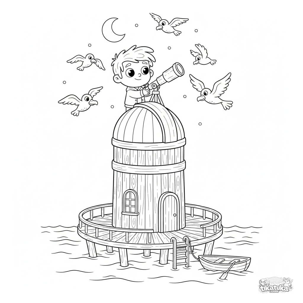 Раскраска для детей 10-12 лет: плавучая обсерватория с телескопом на морской платформе. Детальная сцена с астрономом, птицами и лодкой для творческого раскрашивания.