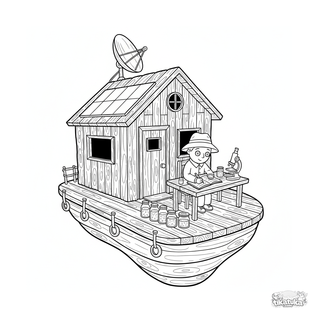 Раскраска для детей 10-12 лет: старая плавучая исследовательская хижина с спутниковой тарелкой на компактной платформе в море. Исследователь записывает данные, на столе микроскоп и банки с образцами.