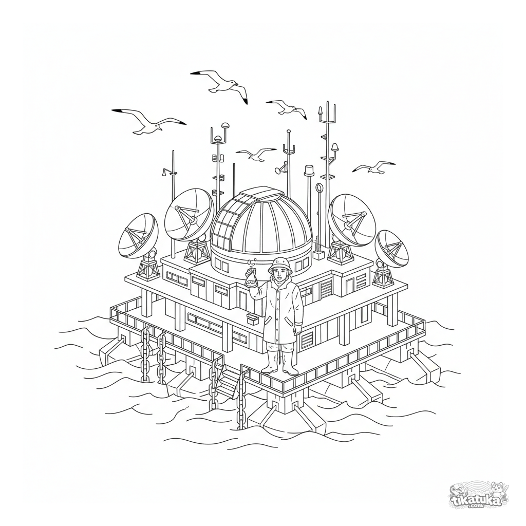 Раскраска для детей 10-12 лет: детализированная плавучая научная лаборатория в море с обсерваторией, спутниковыми тарелками и учёным. Сложная сцена для творческого раскрашивания.