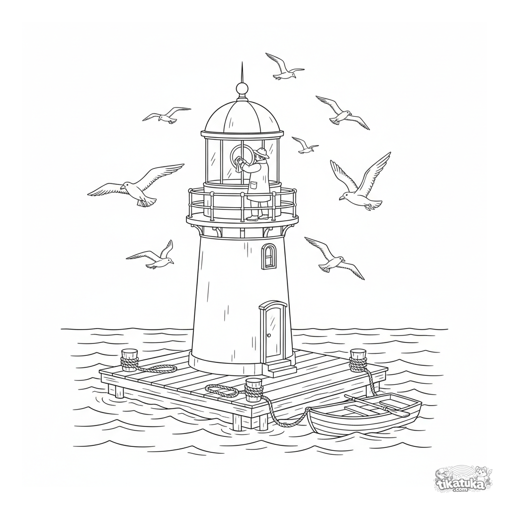 Детализированная раскраска плавучего маяка на морской платформе для детей 10-12 лет. Изображен смотритель, птицы и морские детали.