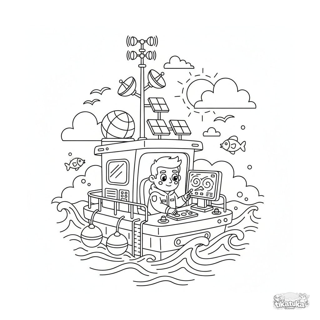 Раскраска для детей 10-12 лет: детализированная плавучая метеостанция с мачтой приборов, солнечными панелями и метеорологом, следящим за штормом в открытом море.