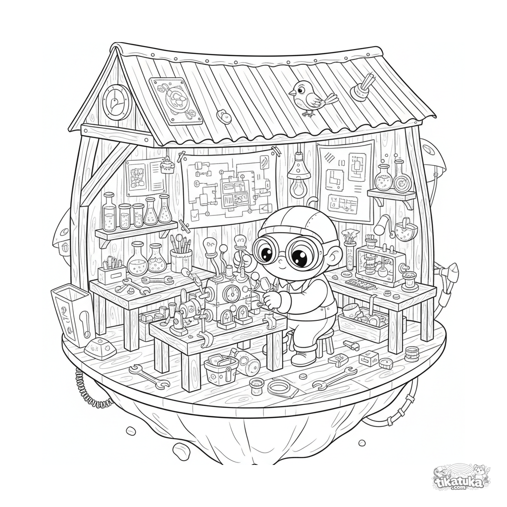 Раскраска для детей 10-12 лет: захламленная плавучая мастерская изобретателя на платформе в море. Изобретатель в очках настраивает устройство, вокруг верстаки, инструменты и чертежи.