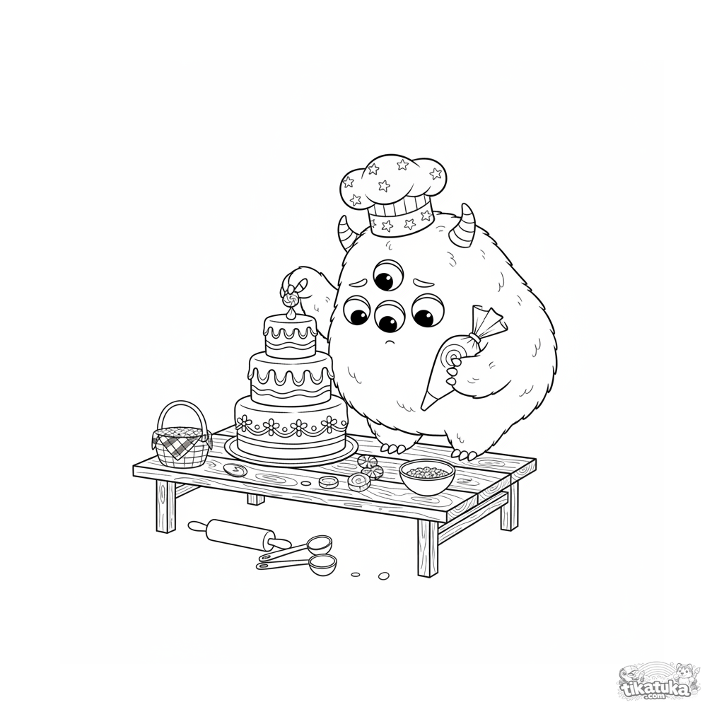 Детальная раскраска для детей 10-12 лет: пушистый монстр в шляпе кондитера украшает торт на пикнике. Много элементов для творческого раскрашивания.