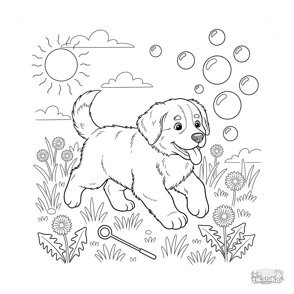 Раскраска: пушистый щенок бернской овчарки весело гоняется за мыльными пузырями на лугу. Для детей 3-6 лет. Контуры четкие, поля широкие.