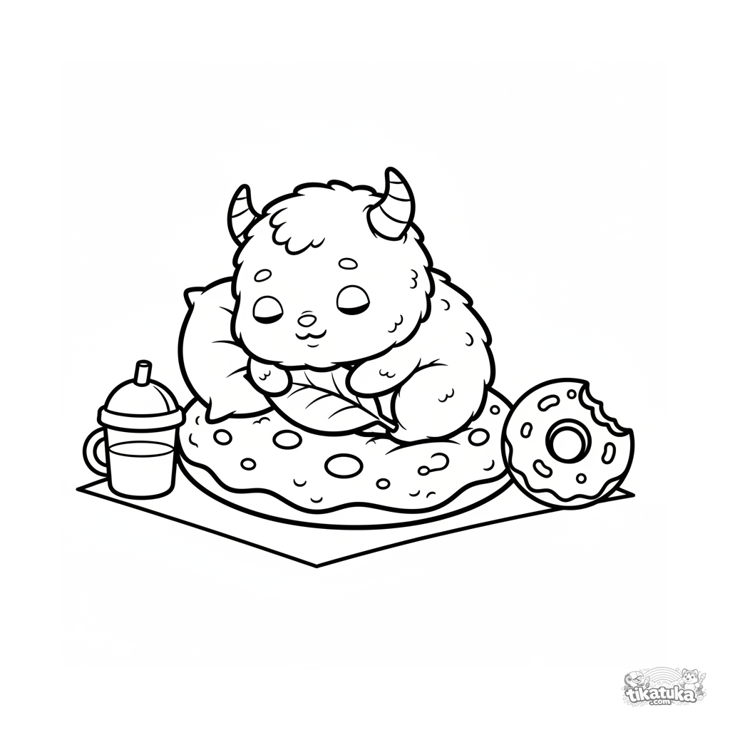 Простая раскраска для малышей 2-3 лет: пушистый монстрик спит на большой печеньке на пикнике. Крупные формы, мало деталей, идеально для первых карандашей.
