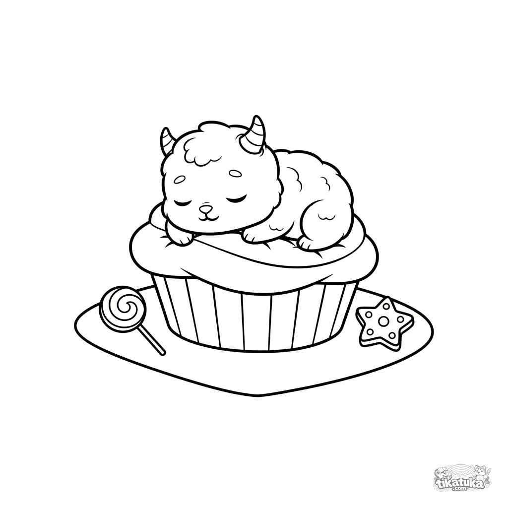 Простая раскраска для малышей 2-3 лет: пушистый монстрик спит на большой подушке-кексе на пикнике. Крупные формы, мало деталей.